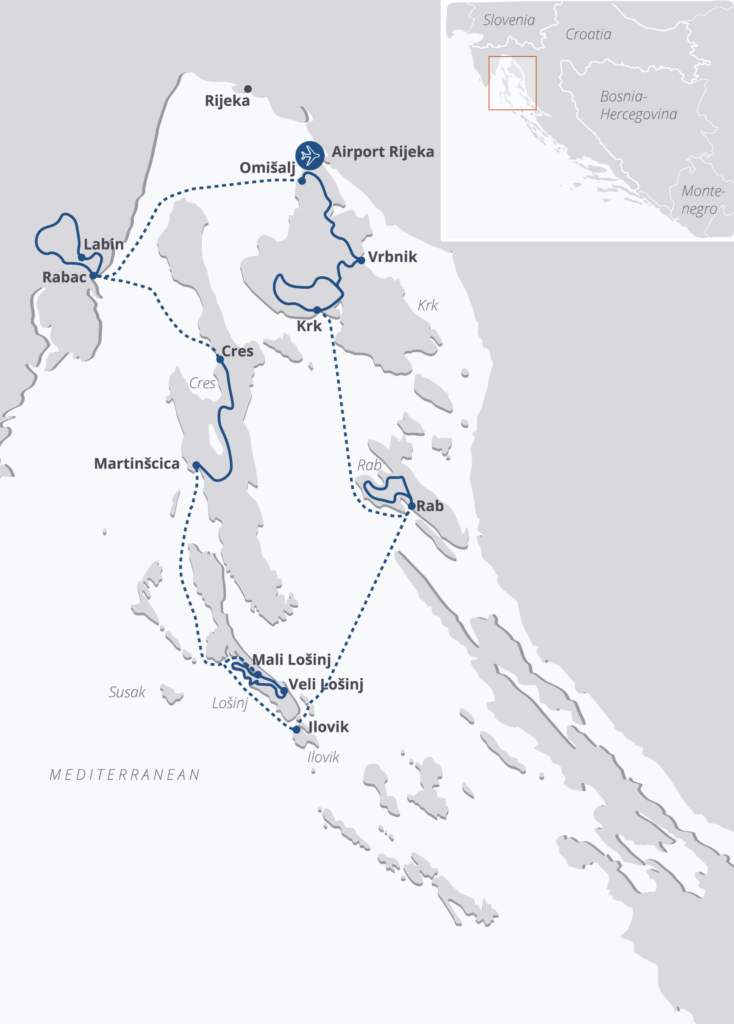 Protected by the towering Velebit mountain range in the east and embraced by the Istria Peninsula in the northwest lie the Kvarner Bay islands. Quiet coves with crystal clear water surround the dramatic landscapes of the Kvarner Bay. Green hills and rocky moon landscapes give way to small harbour towns rich in both history and culture. Discover the charm of the Adriatic Sea by bike and boat on board one of our charming motor yachts.