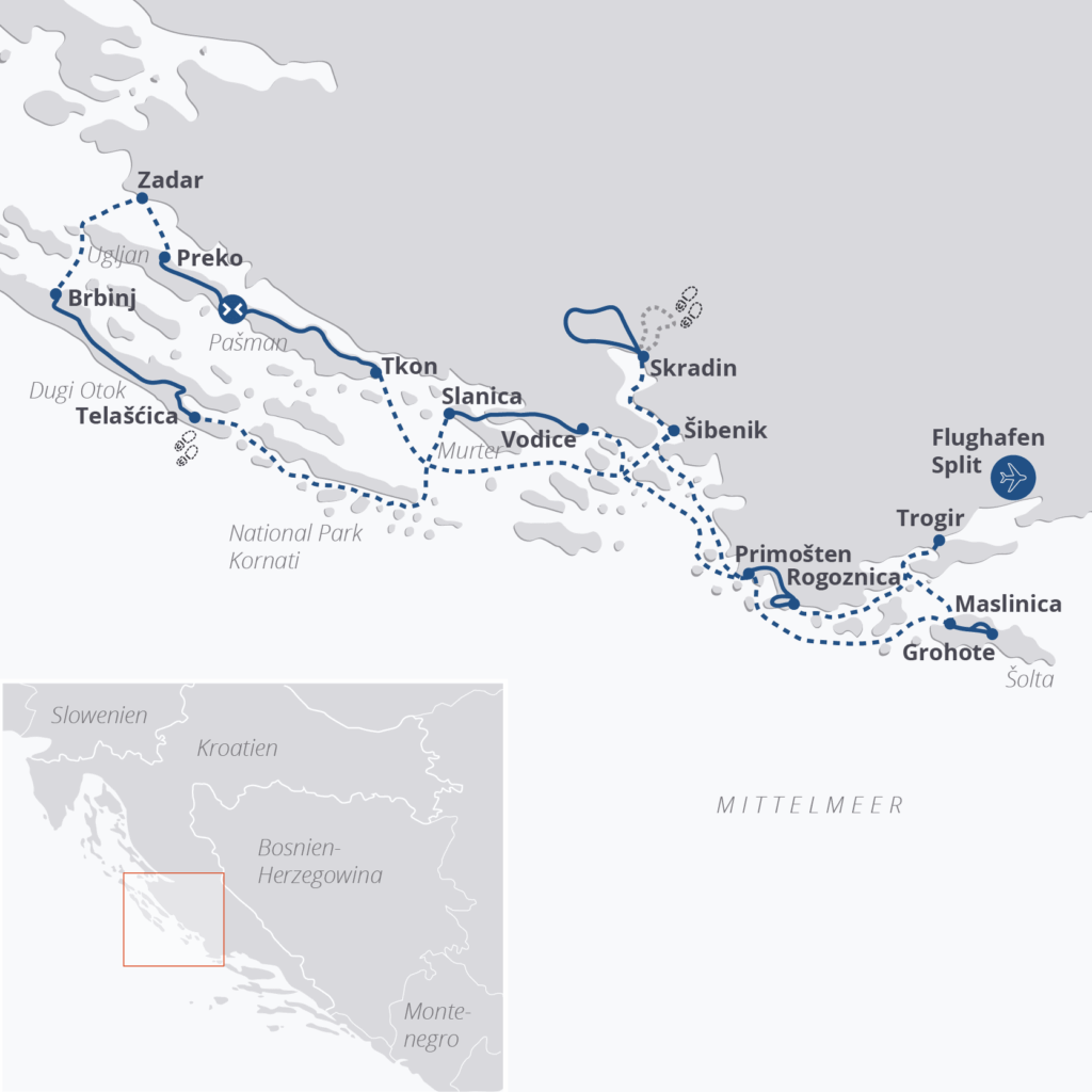 Das Inselhüpfen zu den Nationalparks ist unsere „grüne“ Tour in Kroatien und auch eine der leichtesten. Hier steht die atemberaubend schöne Landschaft im Vordergrund.Die meisten der besuchten Inseln sind nur dünn besiedelt. Das Schiff bringt Sie den Krka-Fjord bis fast zu den spektakulären Wasserfällen hinauf und in den Nationalpark Krka hinein. Südlich der Insel Dugi Otok unternehmen Sie eine unvergessliche Kreuzfahrt durch den Nationalpark der Kornaten, in dem zahllose kleine Inseln wie auf einer Perlenkette aufgereiht dicht an dicht nebeneinander liegen.Neben diesen eindrucksvollen Naturerlebnissen kommt auf dieser Reise auch die Kultur nicht zu kurz. In Šibenik und Zadar erfahren Sie mehr über die geschichtsträchtige Vergangenheit der Region und Sie besuchen mit Ihrem Reiseleiter die wichtigsten Baudenkmäler Norddalmatiens.